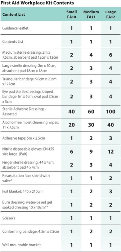 The kit includes essential first aid supplies such as plasters, dressings, and bandages to support effective workplace first aid response. Approximate casing dimensions vary by model, ranging from 23 × 23 × 9.5 cm to 35 × 33 × 9.5 cm.